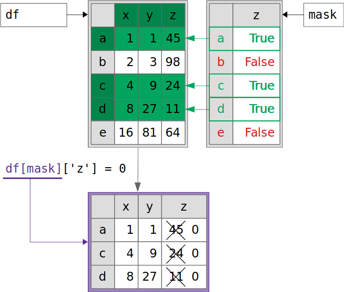 df[mask]返回的是一个新的DataFrame。该DataFrame中存储的是df中满足条件的数据的复制。df[mask][“z”]将复制的DataFrame中的z赋值为0,df并未发生改变。