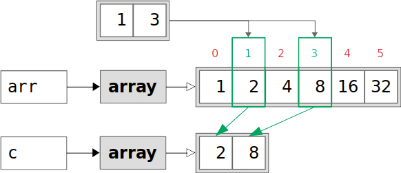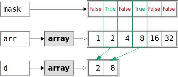 Keep in mind that these examples show how you can reference data in an array. Referencing data returns views when slicing arrays and copies when using index and mask arrays. Assignments, on the other hand, always modify the original data of the array. arr[1] = 64虽然是index索引也会改变数据的值 链式索引中视图和复制的表现则不相同。
